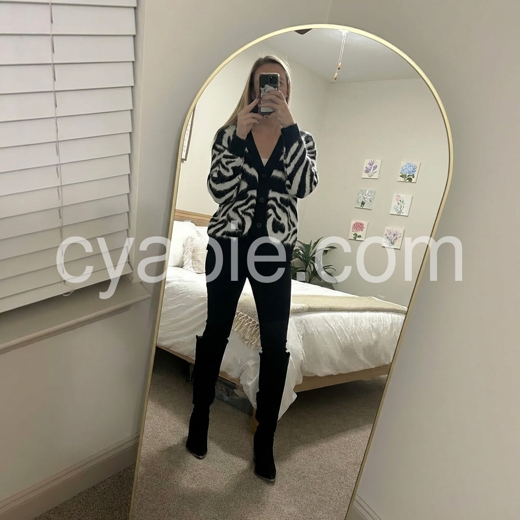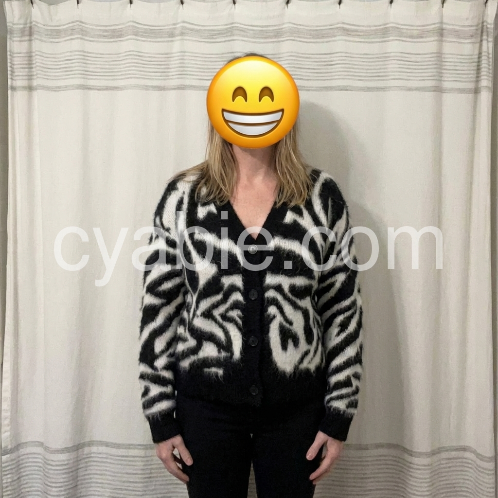 Yes!It runs true to the garment size chart please choose your size based on your measurements.Elevate your wardrobe with this bold zebra-print knit cardigan crafted from a luxurious soft mohair blend. Its distinctive pattern adds a striking visual contrast, while the mohair fibers ensure lightweight warmth and a plush texture. Designed for both style and comfort, this cardigan is ideal for layering during transitional seasons, providing a sophisticated yet edgy statement piece to your collection.