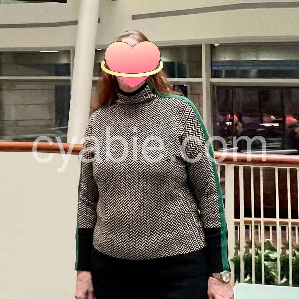 This lightweight and cozy long-sleeved turtleneck is just in time for the colder months ahead. A sophisticated black and white chevron print with dark forest green stripes on the sleeves refresh your winter wardrobe with a chic yet elegant look, perfect for wearing to a dinner party, the office, and so much more. Machine wash normal with light colors or hand wash. Bleach if needed. May be hung up to dry or lay flat. Tumble dry with low heat. Light ironing if needed.