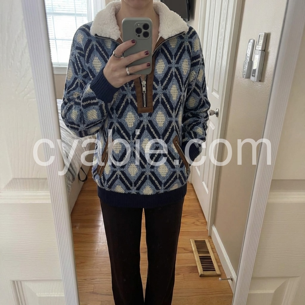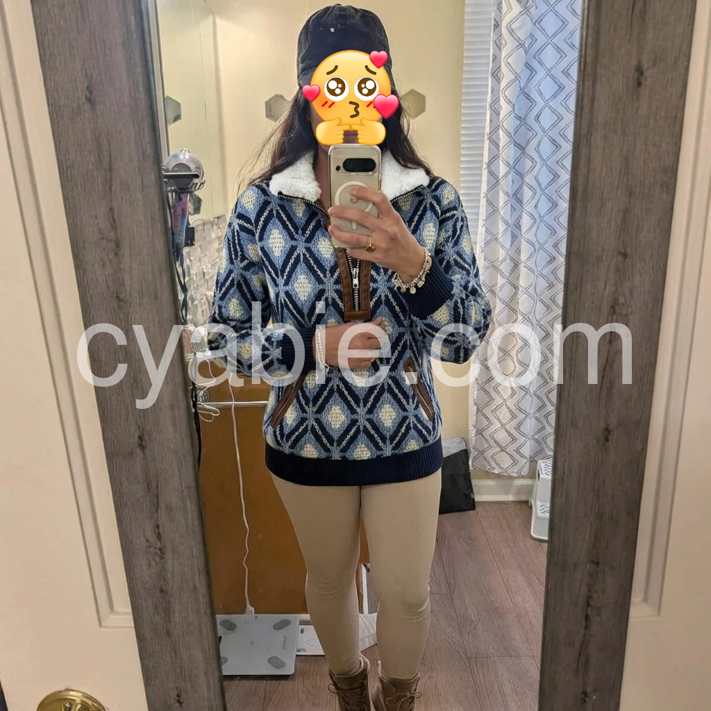 Yes!It runs true to the garment size chart please choose your size based on your measurements.Elevate your cold-weather wardrobe with this sophisticated knit sweater, featuring a striking blue geometric pattern that adds visual interest to any ensemble. The fleece lining provides exceptional warmth and comfort, making it an ideal choice for layering or standalone wear during transitional seasons. Crafted from quality knit fabric, this piece combines contemporary design with practical functionality. The geometric detailing brings modern flair while maintaining versatility—pair it effortlessly with jeans, trousers, or skirts for polished everyday styling.